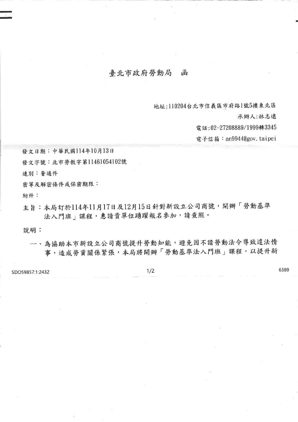 臺北市政府衛生局於 114年9月10日 發函通知: