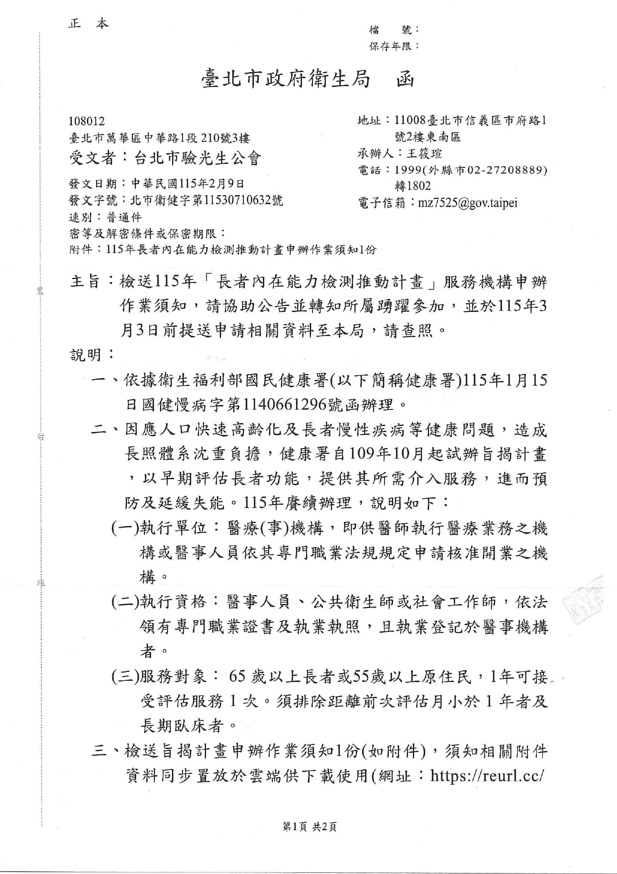 臺北市政府衛生局推動115年「長者內在能力檢測推動計畫」,檢送服務機構申辦作業須知,