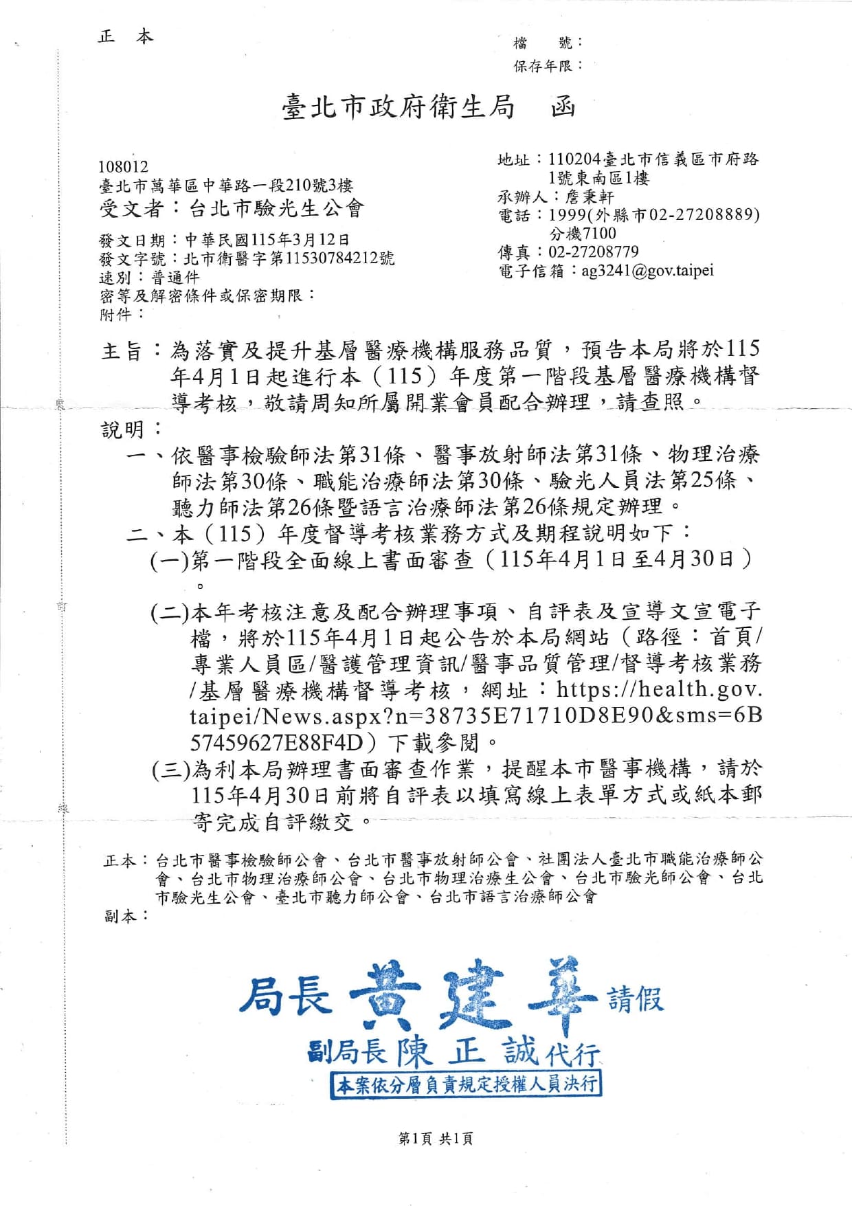 臺北市政府衛生局辦理115年度基層醫療機構第一階段督導考核(4月1日起實施)