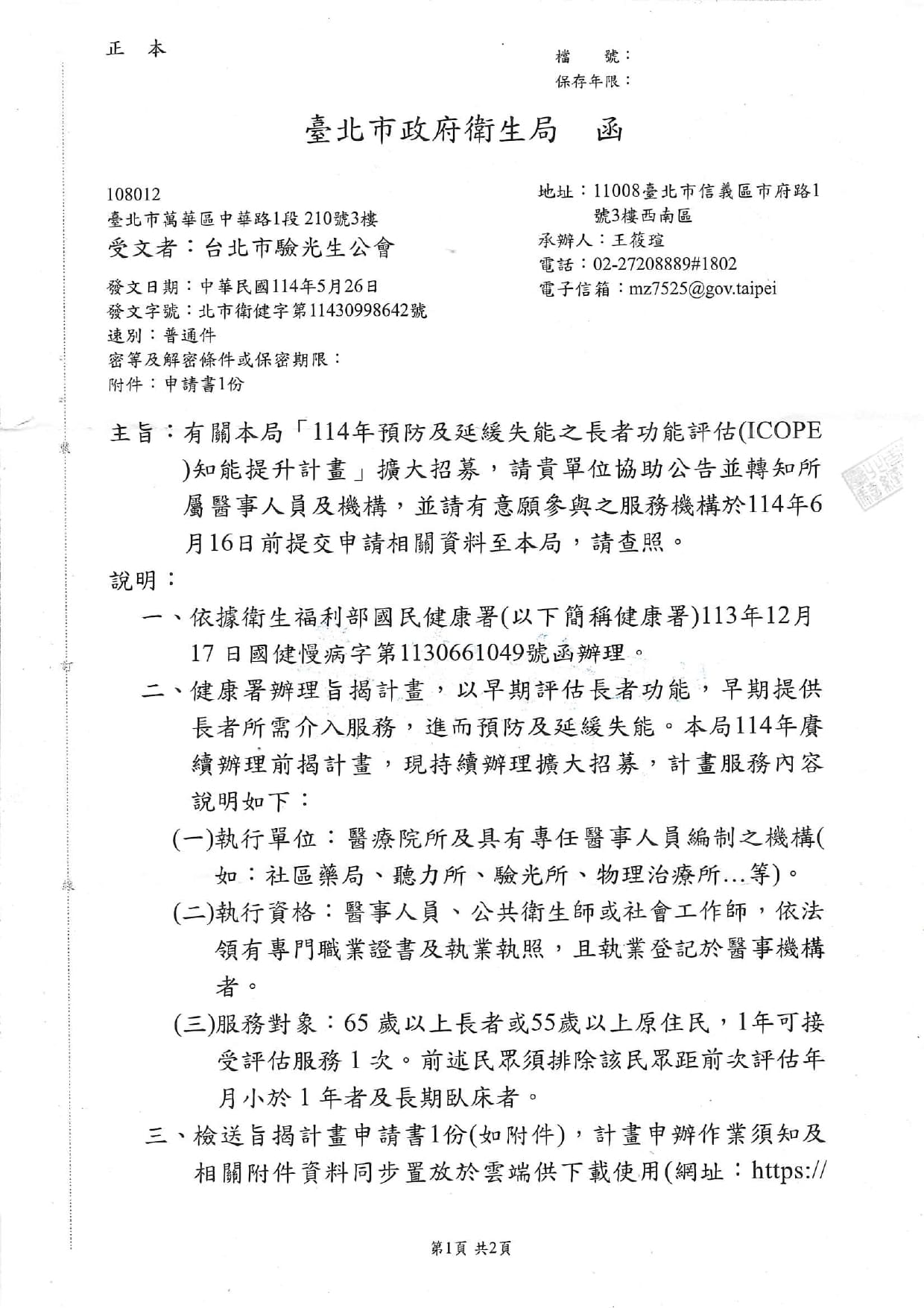 【會員通知】 轉知臺北市衛生局北市衛健字第11430998642號函,衛生局「114年預防及延緩失能之長者功能評估(ICOPE)知能提升計畫」擴大招募,轉知所屬會員及機構。特此通知,請查照。