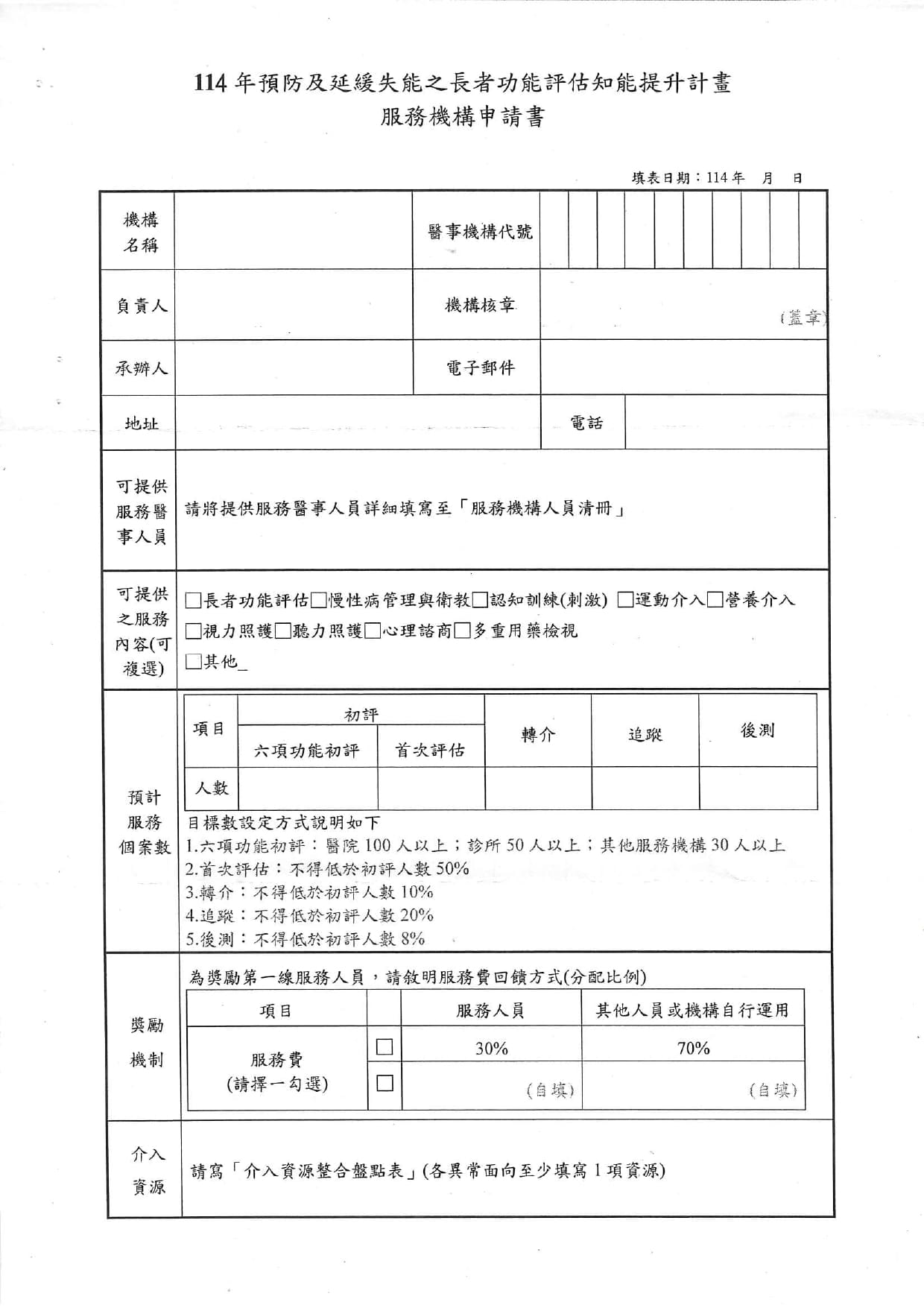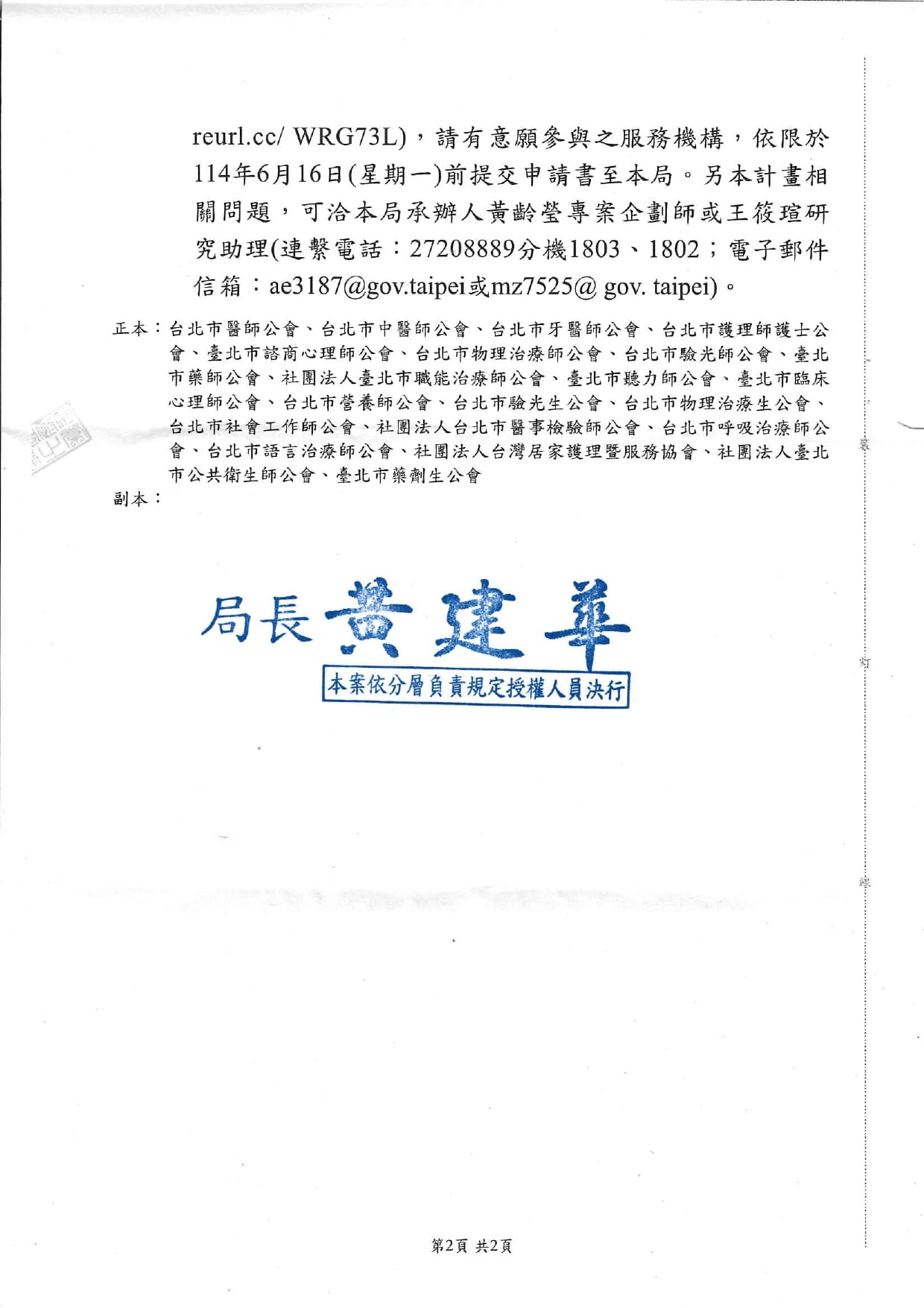 【會員通知】依據臺北市衛生局北市衛健字第11430998642號函辦理,該局辦理之「114年預防及延緩失能之長者功能評估(ICOPE)知能提升計畫」,目前擴大招募參與機構,敬請各所屬會員及服務機構踴躍參與。有意願參與之機構,請於114年6月16日前依函文說明,備妥申請資料並逕行送交臺北市衛生局。特此通知,請查照。