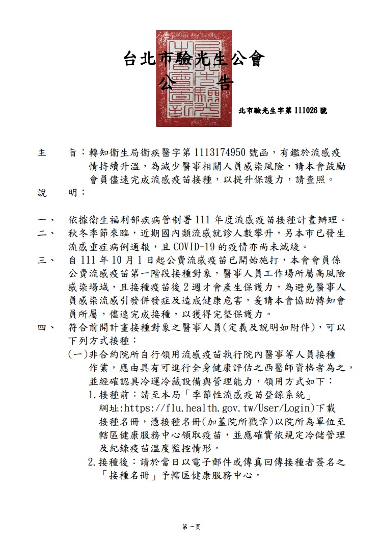 【會員通知】轉知衛生局衛疾醫字第1113174950號函,有鑑於流感疫情持續升溫,為減少醫事相關人員感染風險,請本會鼓勵會員儘速完成流感疫苗接種,以提升保護力。