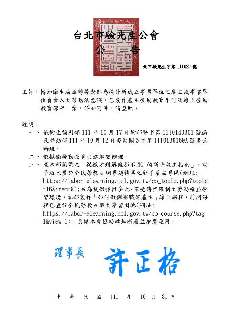 【會員通知】轉知衛生局函轉勞動部為提升新成立事業單位之雇主或事業單位負責人之勞動法意識,已製作雇主勞動教育手冊及線上勞動教育課程。